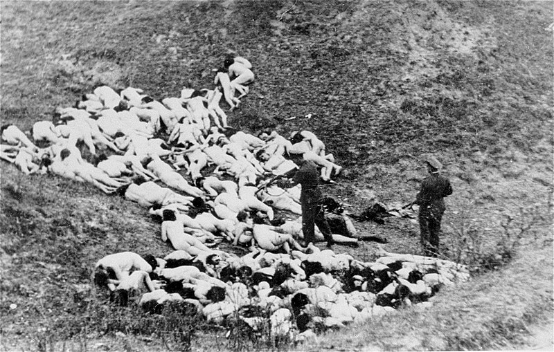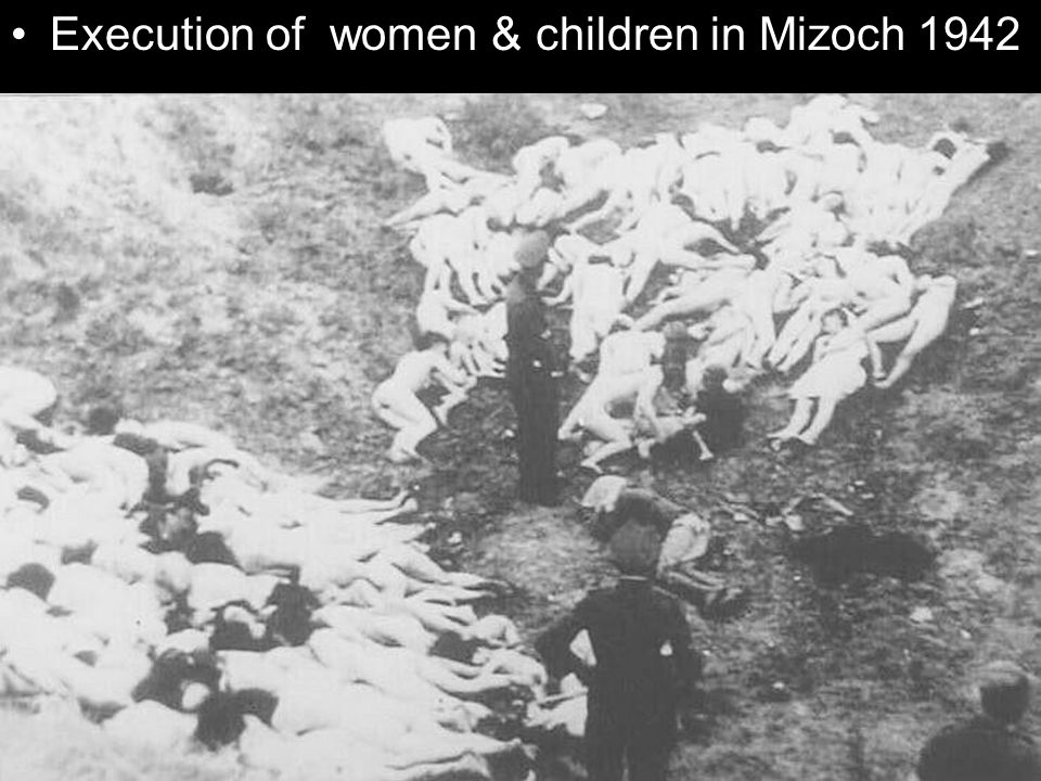 (German officer executes Jewish women who survived a mass shooting outside the Mizocz ghetto, 14 October 1942.)