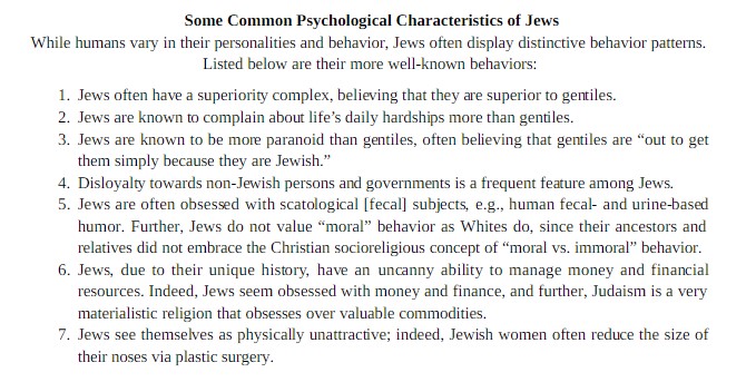 The stereotypes presented in this post are actually the very real character traits of narcissists and psychopaths. I’ve had discussions across several platforms today and noticed that the common POV of many so-called “blacks” is indeed very anti-Jewish. Wether it’s the follower of Louis Farrakhan or the loud and proud Afrocentrist.. the common theme of discussion today had been THE JEWISH CABAL is evil. I’ve heard that both Gypsies and Jews are races of pure undiluted evil. I’ve heard the very same anti-Semitic viewpoints as I read and heard in “white supremacist” writings and lectures.