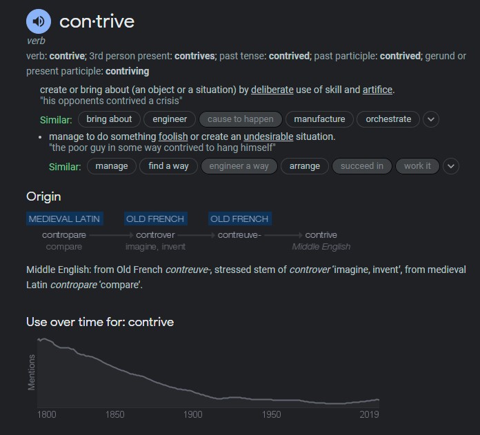 My last few posts have been contriversial to those that may not know the actual meaning of the word “CONTRIVE”. In the spirit of intellect, over, and understanding both, I choose to start this writing by looking into the meaning of the container that is the word CONTRIVE.