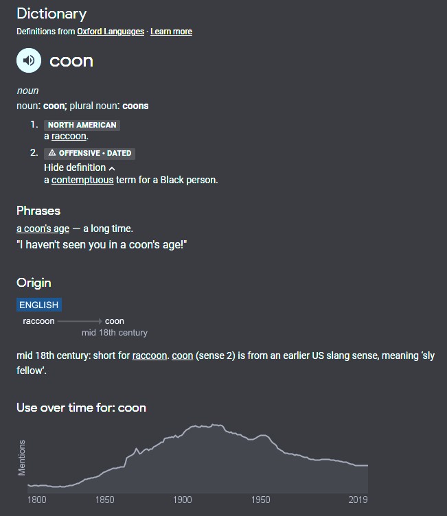 As usual, we will make sure to take the time to over and understand fully what the term “COON” means in modern English lexicon. This is very serious stuff I’m presenting here and none of what I’m showing should be taken lightly.